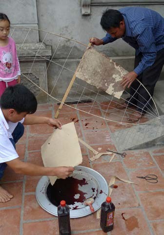 According to Mr Ngô Quý Sơn the paper used is “giấy-bán” where giấy is paper in Vietnamese. The kite paper is made of “giấy dâu tằm”, i.e. mulberry paper ( Broussonetia papyrifera) which is grown in Phú-Thò province located about 40km north of Hanoi (see also our notes on the papermaking villages around Hanoi).