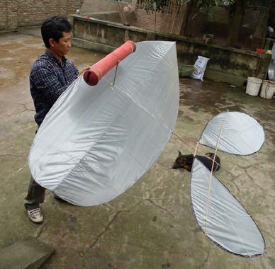 Kites from Song Vân (village 1) were covered with a form of lightweight grey/silver rayon fabric.