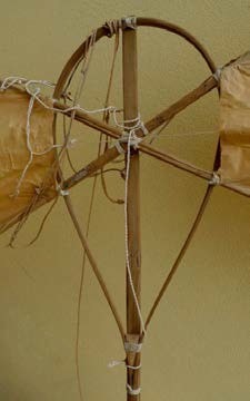 Type 3a. This kite is the “Fairy” or “Angel” kite that was seen in Bá Dương Nội at Mr Nguyễn Hữu Kiêm’s house. The main wings are approximately figure of eight shaped. The body has a rounded head and a delta shaped tail. The bamboo construction is quite complex as can be seen in the detail photograph that shows the head/body.