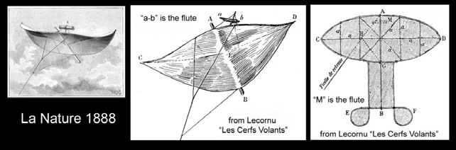 After returning from Vietnam, Paul found an original copy of the article “Le Cerf-Volant A Musique Au Tonking” that included the steel engraving. Whereas we had initially thought that the “flute” was somehow suspended by a wire, it became quite clear that we were mistaken. What we had thought was the flute was, in fact, the central open mouth of a very large flute. We are not sure if such flutes exist in Vietnam today, although these single tone Aeolian flutes do appear in Kalimantan in Indonesia where they are flown in pairs, i.e. attached separately on the inner wing, on large bird kites. In 1886 Albert Challan de Belval wrote in his “Au Tonkin”61; “Bamboos are frequently found placed deliberately around the villages. Quite broad holes are cut into these bamboos which turn them into real organ pipes which resonate sadly under the action of the wind. These sounds act to dispel any bad spirits which might threaten the village. These same bamboos, when they are fixed to kites, sometimes fill the air with shrill sounds that reminds us of our steam engines…..”. It may be that these open-mouthed bamboo “organs” are the same as the flute in the engraving.