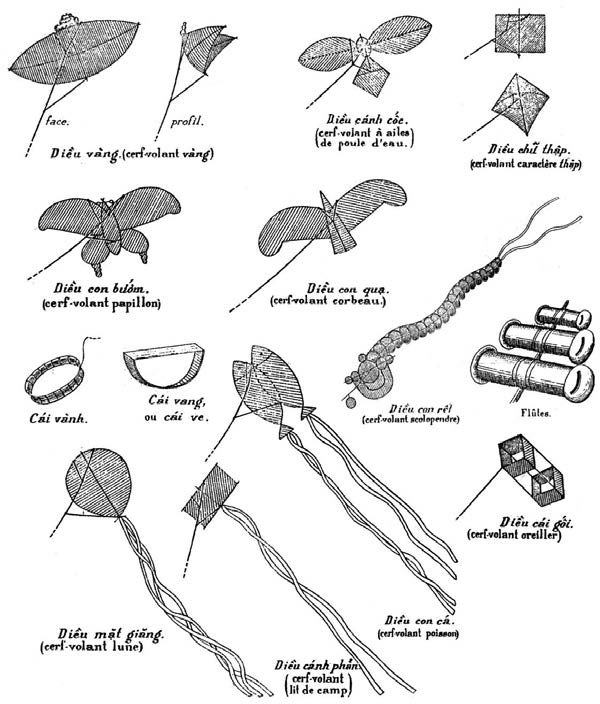 - roughly translated as “…..Today, we will describe the kite, which is one of the preferred games of the young Vietnamese and which, while differing notably from ours by its form, still presents itself as a new attraction, that to be a musician. ….This one appears as a flying bird with spread wings and hanging legs, such as a snipe or an egret, birds of the family of the waders which abound on the rice plantations and which were certainly used as a model by the Vietnamese when making their toy. The spread wings of the bird offer the wind resistance necessary to maintain the kite in the air; the hanging legs, formed of paper bands cut out and weighted at their end, are used to maintain the bird in a favourable position and fulfil the same goal as the tail of the kite here. It is not only the original shape of this toy which makes the principal attraction, indeed, it is designed to recreate the same sight and sound. A piece of bamboo is placed horizontally above the tilted head of the bird. This is closed at its two ends by its natural nodes and [“pecé”] pierced in the middle with an oval longitudinal hole. It is easily understood that this apparatus constitutes a kind of flute and that it reproduces the low notes of this instrument when the air enters the hole and vibrates the air locked up in the tube. It will be also understood that because of dimensions of the bamboo and the central hole, whose diameter is 5 to 6 centimetres, the sound is stronger than that of an ordinary flute.