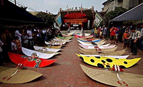 river and the local bamboo matting and timber industries on one side and the villages and paddy fields on the other. The road became increasingly crowded with traffic and street markets as we passed the various riverside villages which were also holding weekend festivals. Eventually the traffic, which included many local industry transport vehicles, became so completely jammed that we were forced to abandon the car and walked the remaining kilometre, through the entrance gateway and down the local lane to the village. By the time we arrived it was evident that the villagers were already in festival mood since there were numerous food stalls and village games lining the roadway, all of which were crowded with people enjoying themselves. We passed through these activities and were taken to the village temple for the initial ceremonies. We met the president of the Bá Dương Nội village kite society, Mr Nguyễn Hữu Kiêm, and later went to his large house for discussions and lunch. Later in the afternoon we returned to the temple and the paddy fields opposite for the kite flying.