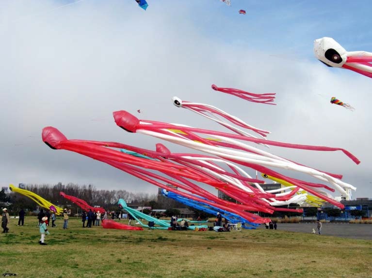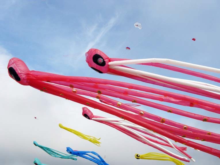The octopi are inflatable kites 11 meters long, built of polyethylene and bound with tape. They have no rigid component in their structure and therefore are held only by the air inside them.