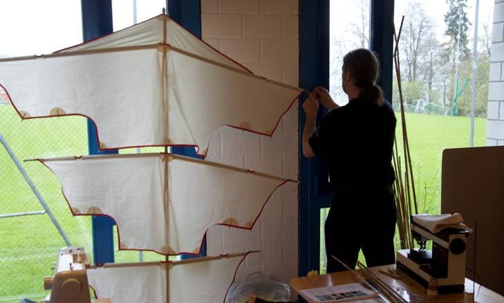 The Historical Kite Workshop was held this year in Beinwil, Switzerland, the final weekend of April. The creation of a three-winged Brogden kite took center stage as the 51 attendees each attempted to complete a replica of this sophisticated historical kite before the weekend ended. Over 20 sewing machines were urged on by their owners, as the project was tackled by workshop attendees new and old. The Brogden kite kit was developed by organizers Christoph Gautschi, who compiled an informative photo-history of the kite and wrote the step-by-step plans, and Charles Tacheron, who completed massive amounts of bamboo- work, engineering of ring-fittings, and sail and re- enforcement cutting, which were needed by all. Most participants were able to get their kites into one piece, with the sails completed, and only the line-work remaining to be done.