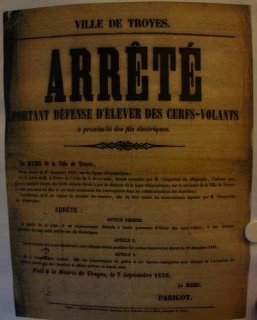 An early French broadsheet warning against kiteflying near telegraph lines. From the 1840s!