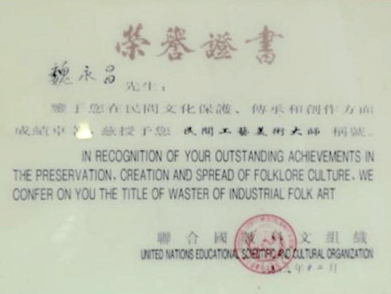 Peter Boekelheide. A certificate from the U.N. honoring Wei Yongchang. Spot the funny English.