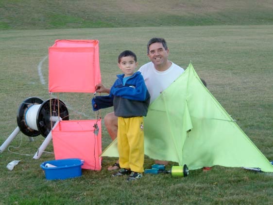 In early 2004, I met Michael Richards, proprietor of Kite Magic. I was looking for kite building materials. I mentioned my plan to break the altitude record and his eyes lit up. He said he would like to be part of the attempt. I thought, “Great, expert help.” He built the first big DT delta from ripstop nylon and fiberglass tube. We tested it locally and it flew extremely well without any changes to bridle settings. It is a powerful and very strong kite design with outstanding flight characteristics, developed from hundreds of hours of testing small kites in local parks. It has remained the only kite design we have used in over six years of record attempts. We currently have four of these kites and a fifth lightweight version with a carbon fiber frame.