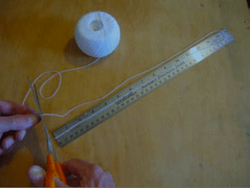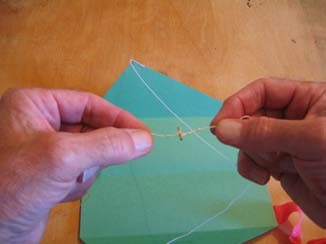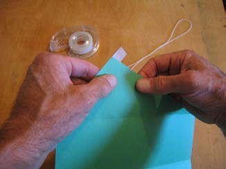 9. Measure and cut an 18” loop of string, tape the ends to the corners, align the corners, pull the string out evenly, and tie a small loop in the center, completing the kite. This kite does not need tails.