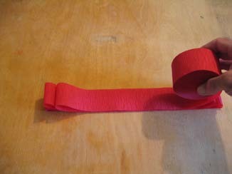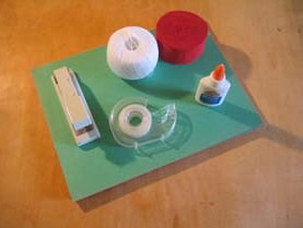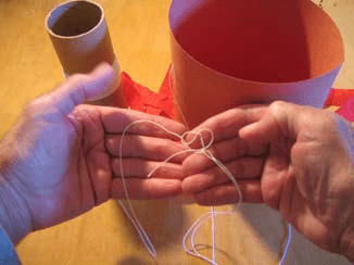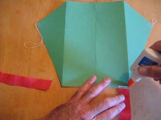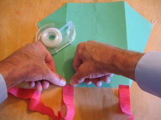 The materials you need are 9” x 12” construction paper, thin cotton string, a 2” roll of crepe paper, glue, and tape. Substitutions may be made. For example, heavy grocery bag paper will do for the construction paper. Strips of newspaper, cut along the grain and softened by crumpling, will work for the crepe paper.
