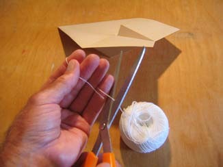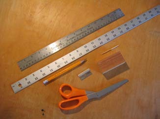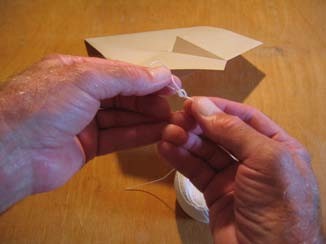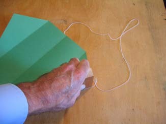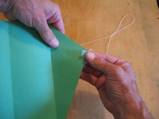 Tools required include a steel straightedge for marking and guiding cuts, a yardstick for measuring bridle string and tails, a pencil for marking positions and lines, a round toothpick for poking holes in paper, a razor blade for cutting paper, a block for pressing folds, and scissors for cutting string and paper. Again, substitutions may be made. A razor blade may be inadvisable for small children, and cuts may be made beforehand by adults or scissors may be used. I used a sailmakers needle instead of the toothpick. You will also need a suitable workplace. If you plan to cut paper with a razor blade, you will want a work board that may be scratched. The side of a cardboard box will do. Newspapers will keep glue off tabletops.