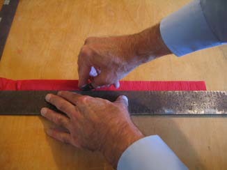4 . Measure the width, which will not be exactly 2”, center the steel straightedge on top of the stack, hold it securely, and, with a sharp new razor, cut the pack in half. You can also cut smaller bundles with scissors. Cut the 2” strips into 3’ lengths, fold them in half three times, tap on the table to align the edges, and cut the bundle in half along the 4 1/2” length.