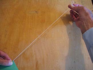 6. This shows how the toggle is used to attach the string to the bridle loop. The loop should be shorter than the toggle, just large enough to push the toggle through endwise. The toggle is rotated square to the string and pulled back to the loop.