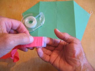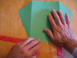 20. Press the tape to the back corner of the kite to attach the tail. However you do it, there will be two tails on the back corners.