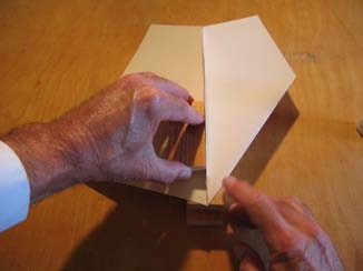 5. Place a straightedge between the center point of the unmarked 12” edge and the center point of a 9” edge. Pull up a corner to make a crease. Do the same to the opposite side. These fold lines will become the wing leading edges.