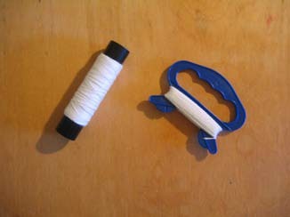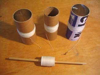 3. Paper may be wrapped around the dowel to get a tight fit. Nylon mono-filament thread works well, but is difficult to make secure knots. I recommend using a fisherman’s snap swivel, shown on the rightmost spool, and following the instructions for making the fisherman’s knot. The leftmost spool has a toggle attachment. The toggle is a 1/2” length of round toothpick or bamboo skewer. The toggle may be used to secure your string to the spool. Poke a hole in the middle of the cardboard spool with a nail and push the toggle through the hole.