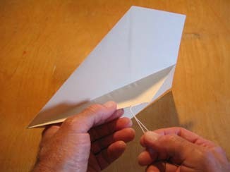 1. My serious interest in kites began years ago when I tried flying paper airplanes as kites. This new design was made just for this project. It is derived from an origami glider, but uses a rectangular sheet of paper. Start by folding the 9” x 12” sheet in half parallel with the short sides.