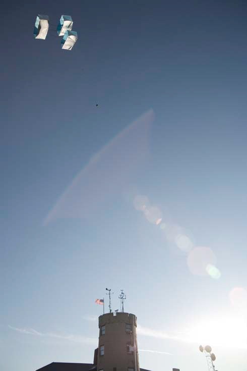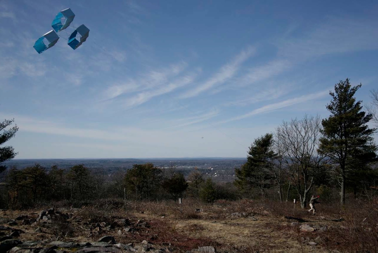 Jane D. Marsching. Test Site: Hargrave triple cell box kite failed experiment from the 1890s remade in 2008 flying over Blue Hill Observatory, March 2008.