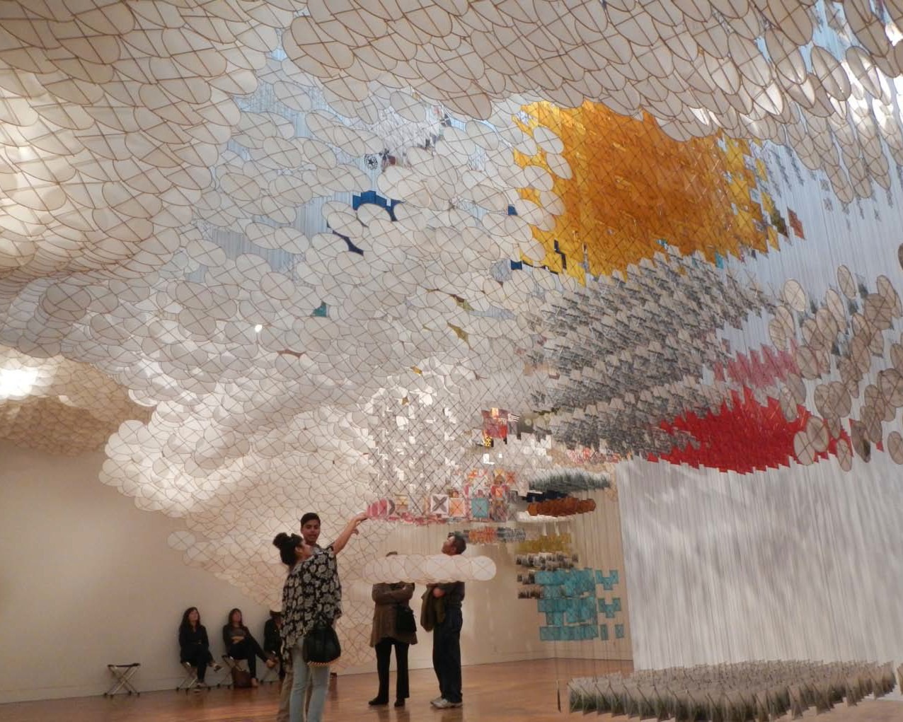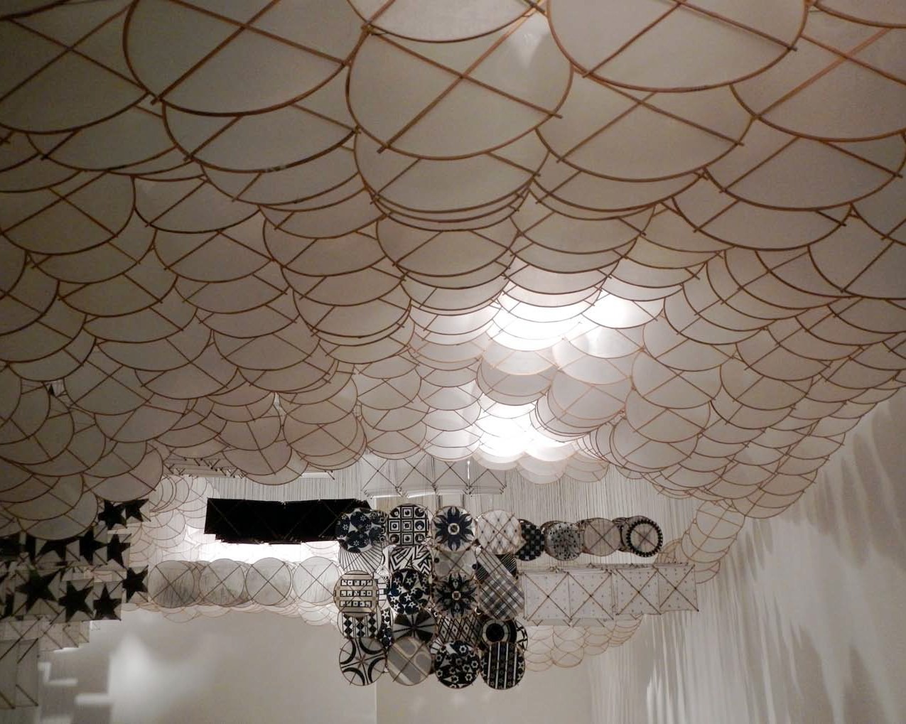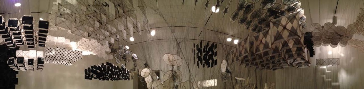 George Peters. Paper, bamboo, and string kite forms suspended from the ceiling create a cloud effect overhead.
