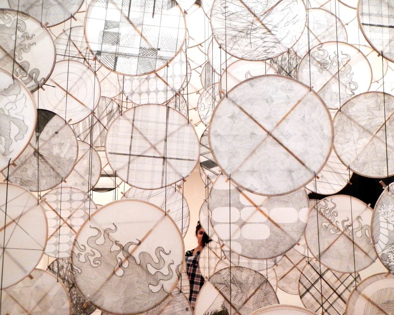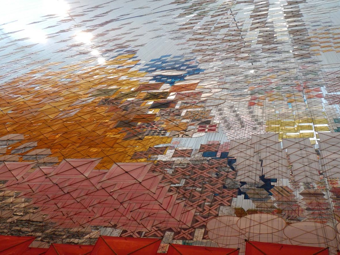 I was told the installation took four people about three full days. Most of the objects are hung individually, having their own line which goes from the kite shape to the ceiling. If you have 10,000 kite objects, there could easily be 10,000 hanging lines.